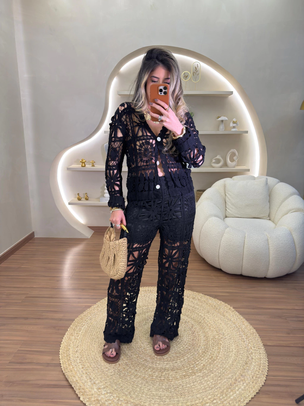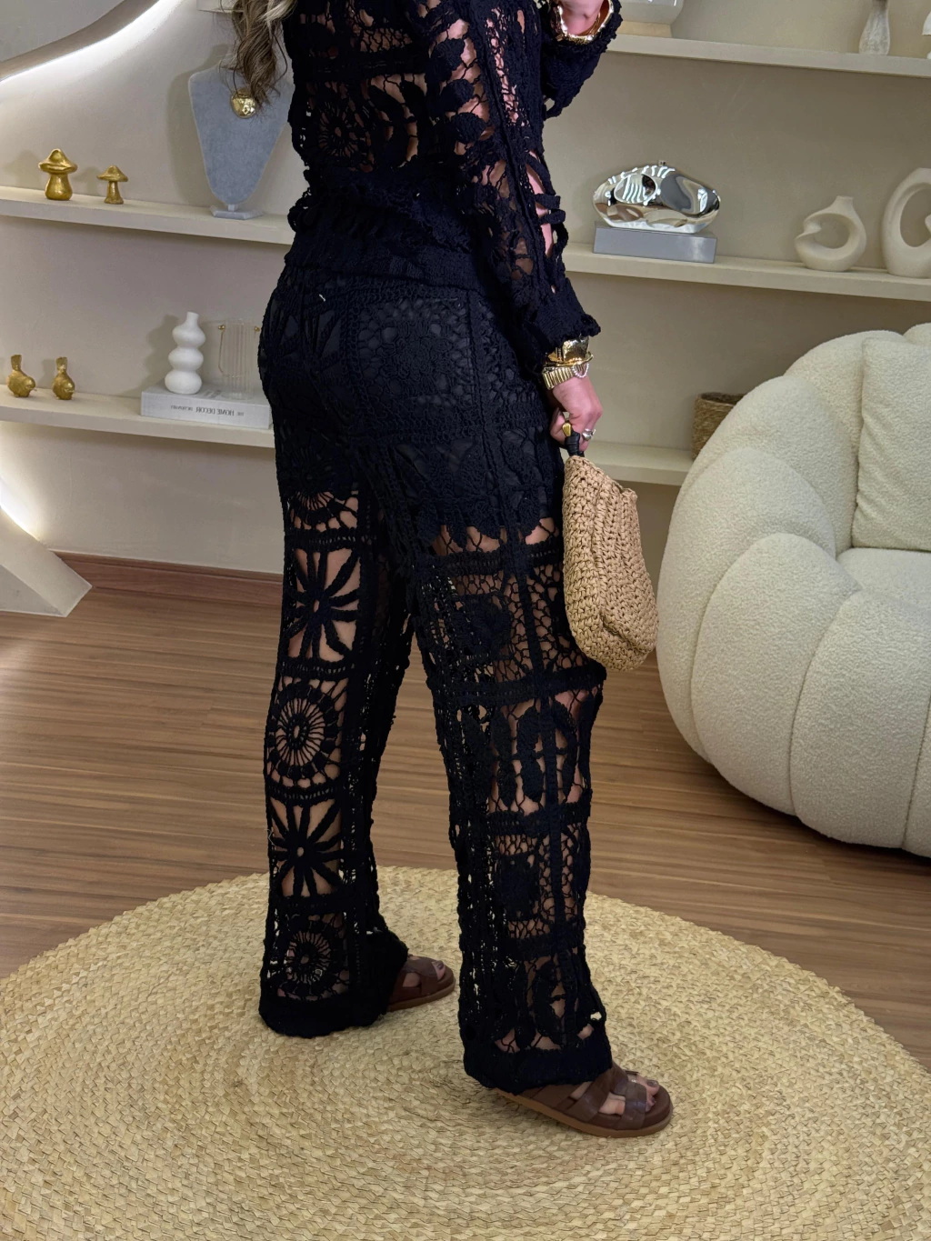 Descubra a Calça Ayla, uma peça essencial para quem busca praticidade aliada à elegância artesanal. Confeccionada em crochê com elástico no cós, ela oferece ajuste perfeito e conforto para o seu dia a dia.