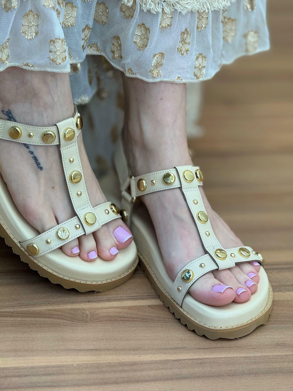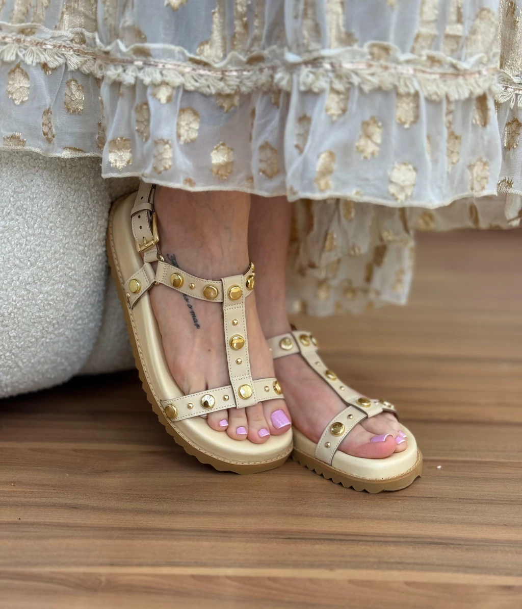 Garanta já a sua sandália rasteira com tachas douradas e transforme seu visual com um toque de elegância e modernidade!