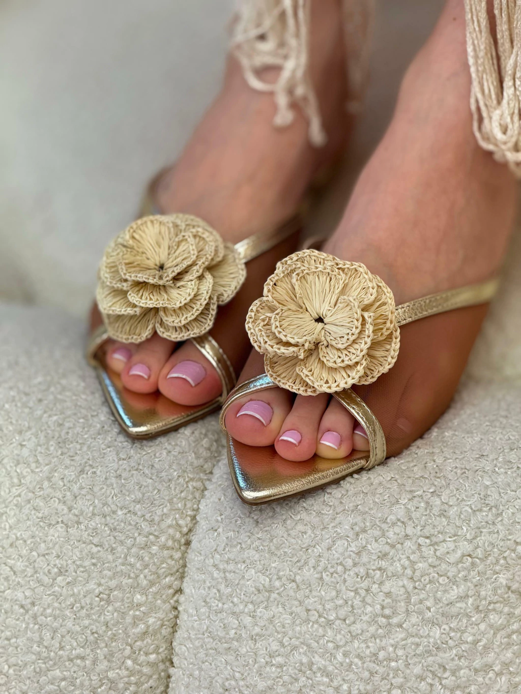 Rasteirinha Feminina Dourada com Flor Aplicada – Elegância e Conforto para Todos os Dias
