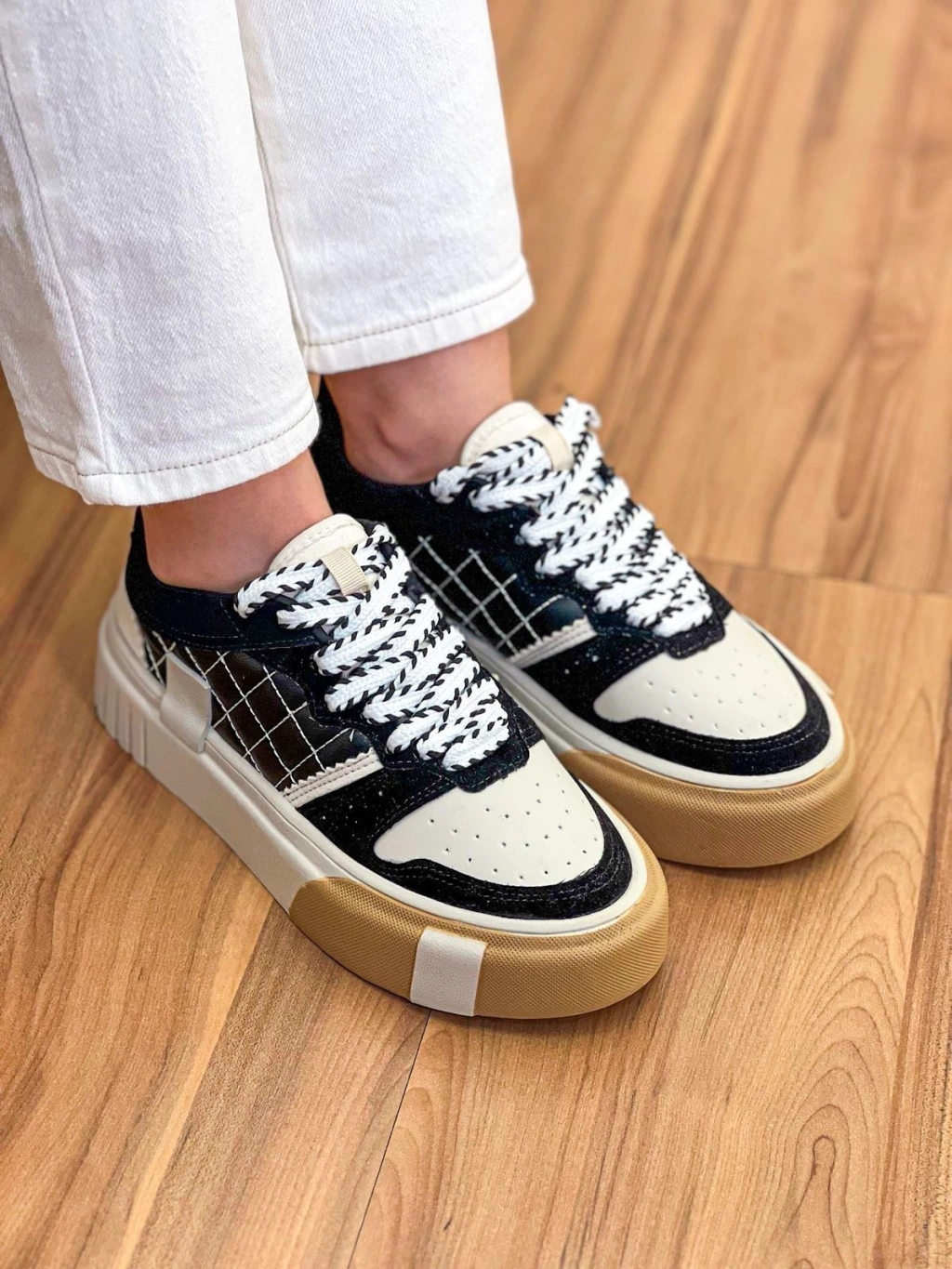 Seu cabedal em preto com detalhe matelassê branco cria um visual elegante e contemporâneo, ideal para complementar looks casuais e urbanos. Os cadarços grossos em preto e branco dão um toque diferenciado, reforçando o estilo moderno do tênis.