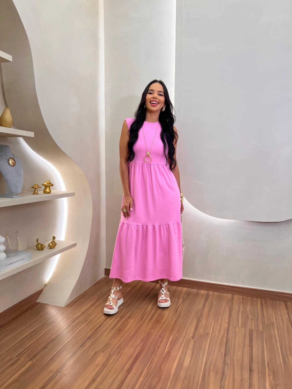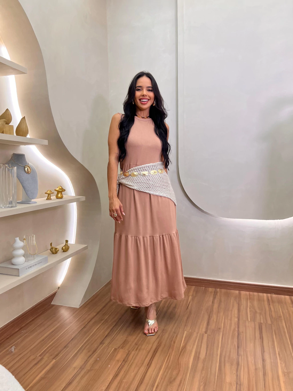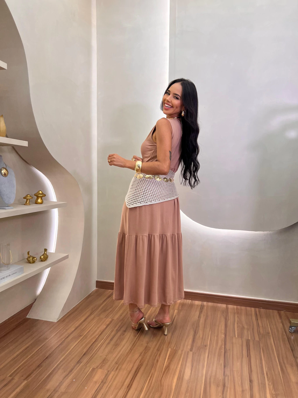 Para referência, nosso modelo veste tamanho 38, mostrando como o vestido realça a beleza natural com seu design fluído e elegante.