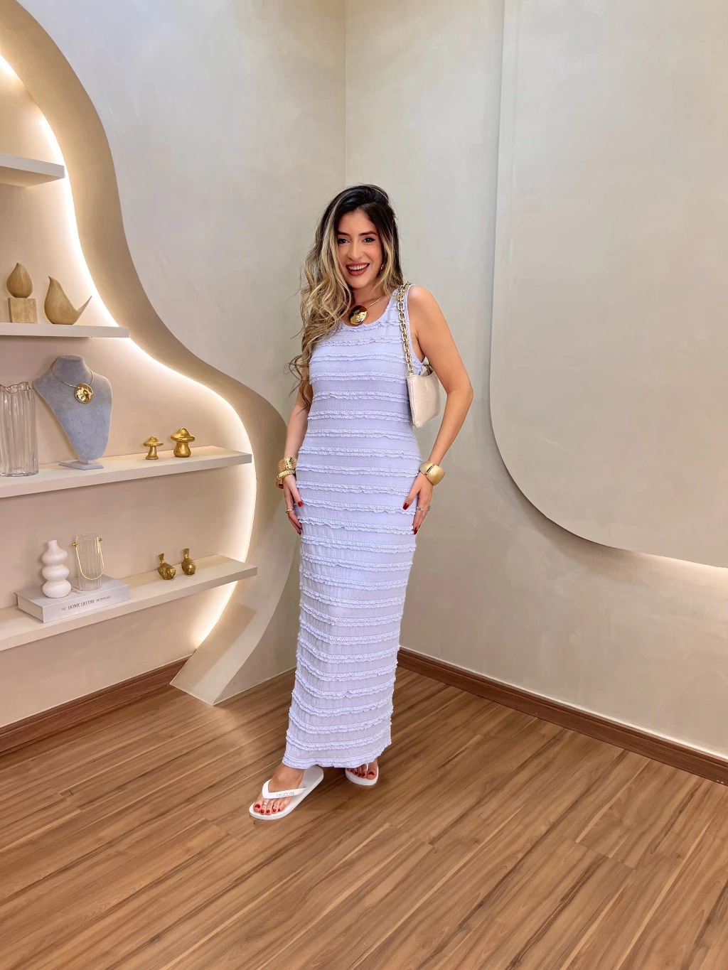 Nossa modelo, com 1,62m de altura, veste tamanho 38 (P), garantindo uma ideia clara do caimento e ajuste do vestido.